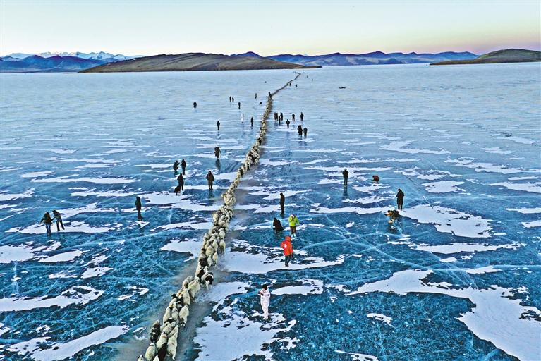 圖為推瓦村冰上牧羊轉(zhuǎn)場(chǎng)現(xiàn)場(chǎng)。記者 潘多 劉楓 攝