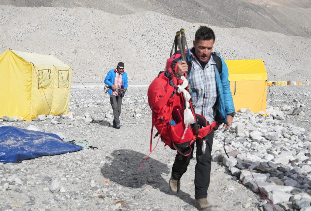 哈康·埃蘭森(右)正在搬運(yùn)自己的登山物資(5月24日攝)。新華社記者 孫非 攝