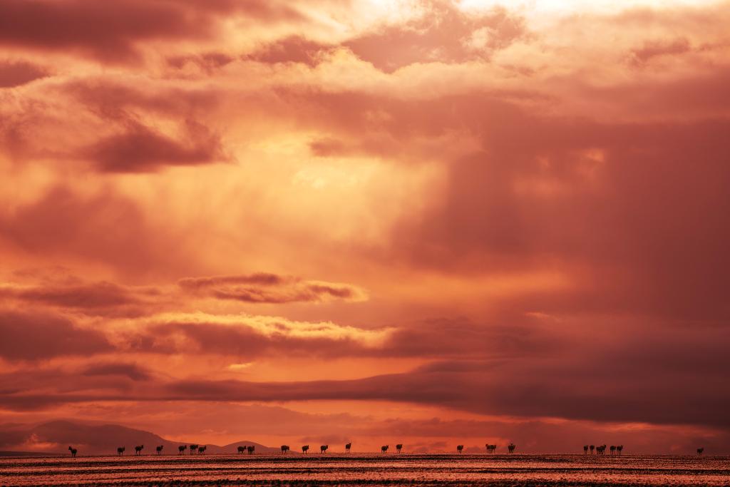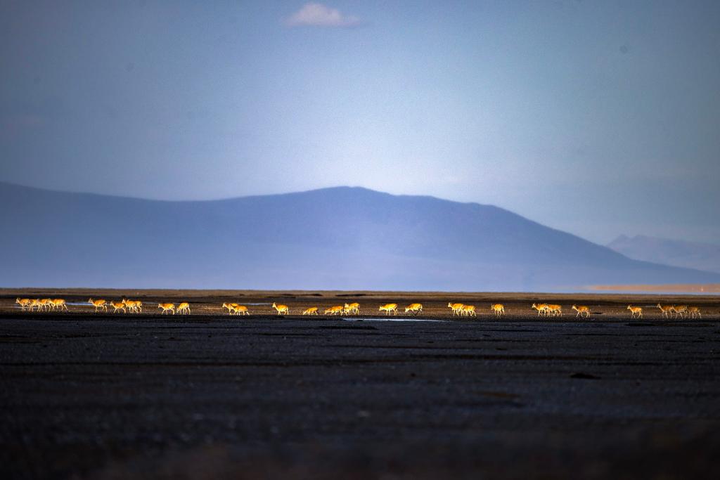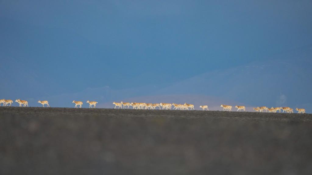 6月13日傍晚在羌塘國家級自然保護區(qū)拍攝的遷徙中的藏羚羊。