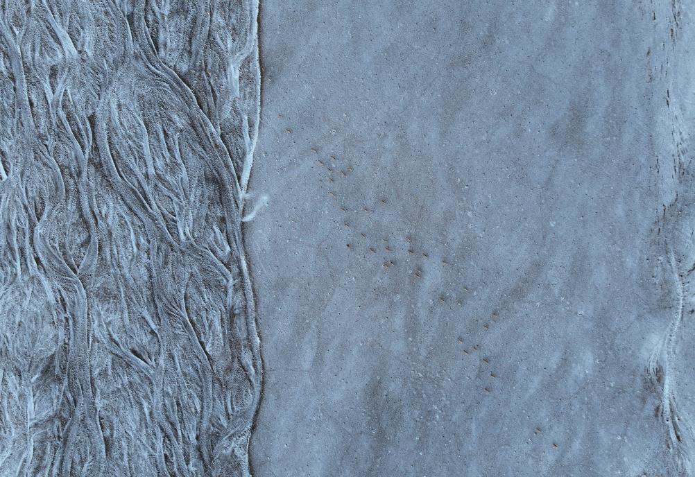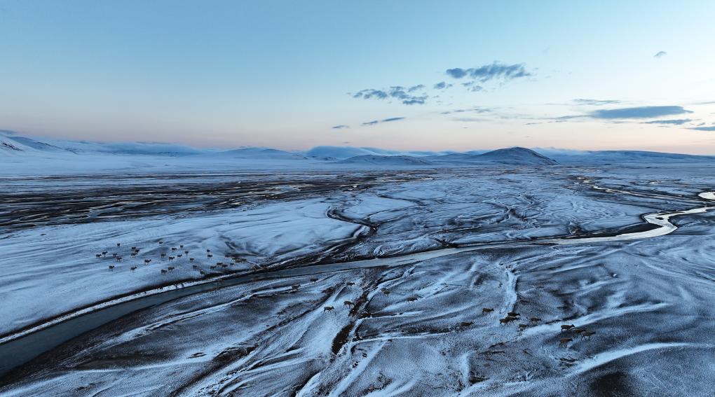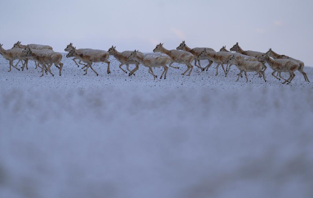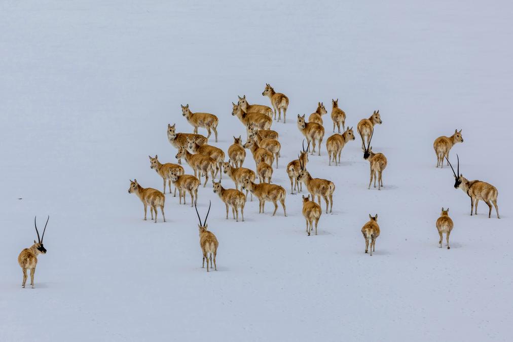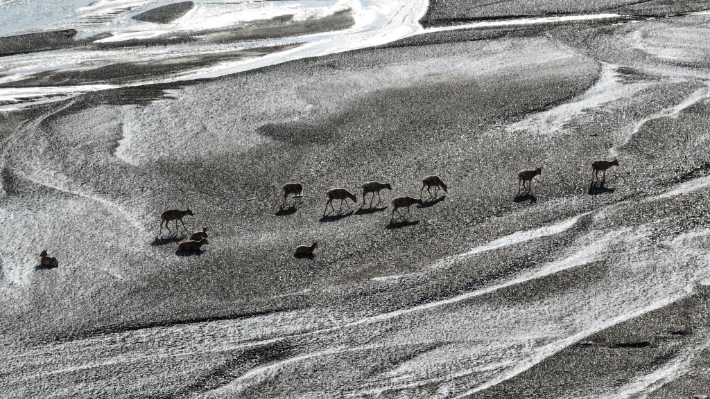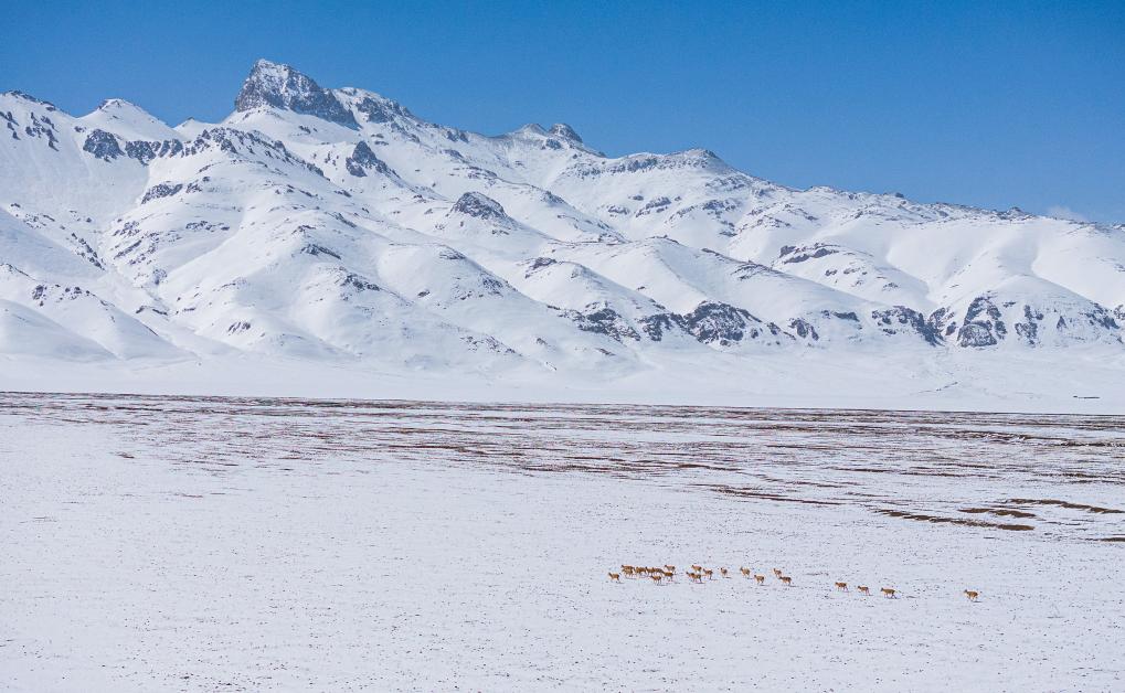 在甜水河畔荒灘雪地中向產(chǎn)羔地遷徙的藏羚羊(6月14日攝)。