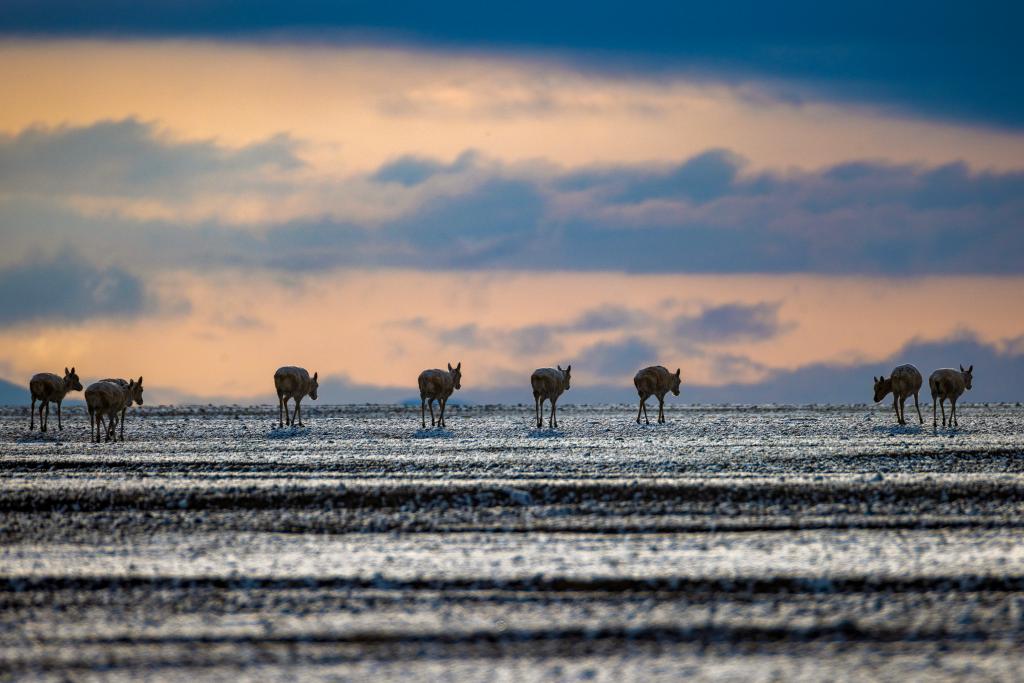 6月15日清晨雪后,在羌塘國家級自然保護區(qū),迎著朝霞前行在遷徙路上的一群藏羚羊。