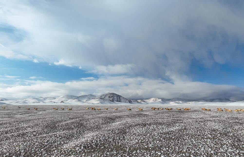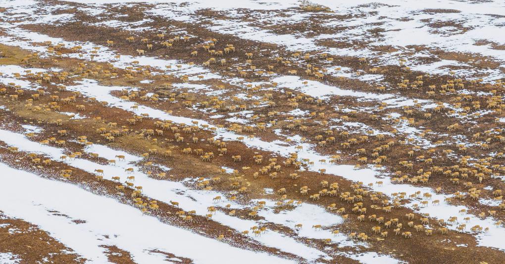 大群遷徙的藏羚羊途徑甜水河畔的荒灘雪地,向產(chǎn)羔地遷徙(6月15日攝)。