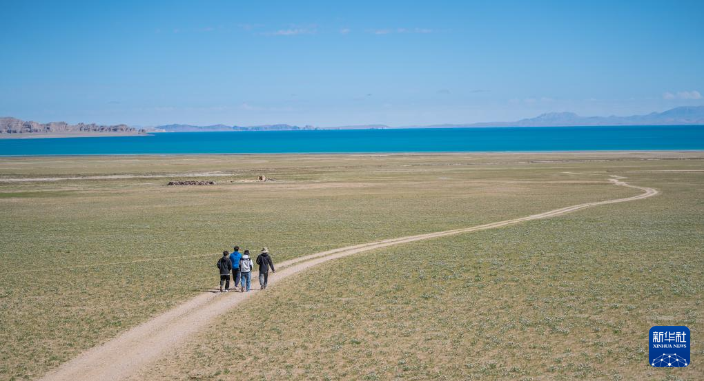 6月22日,游客漫步色林錯湖畔。新華社記者 丁增尼達(dá) 攝