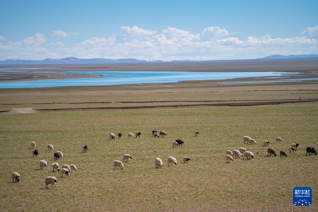 6月22日,羊群在色林錯湖畔草場上吃草。新華社記者 丁增尼達(dá) 攝