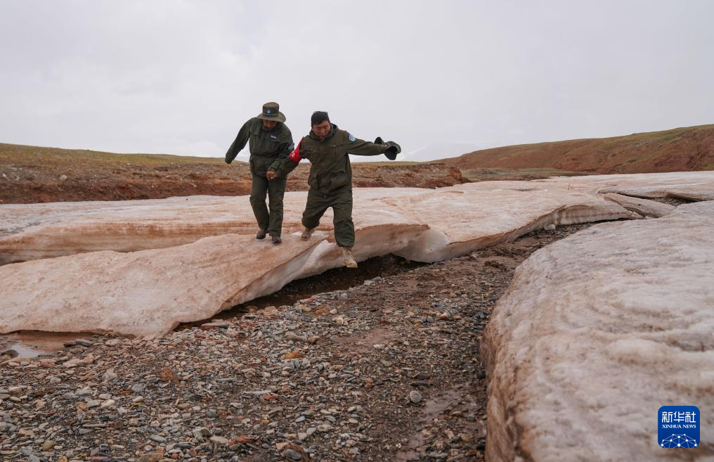 6月15日,羌塘國家級自然保護區(qū)野生動物專業(yè)管護隊員索朗(右)和羅布檢查河面冰凍情況。新華社記者 費茂華 攝