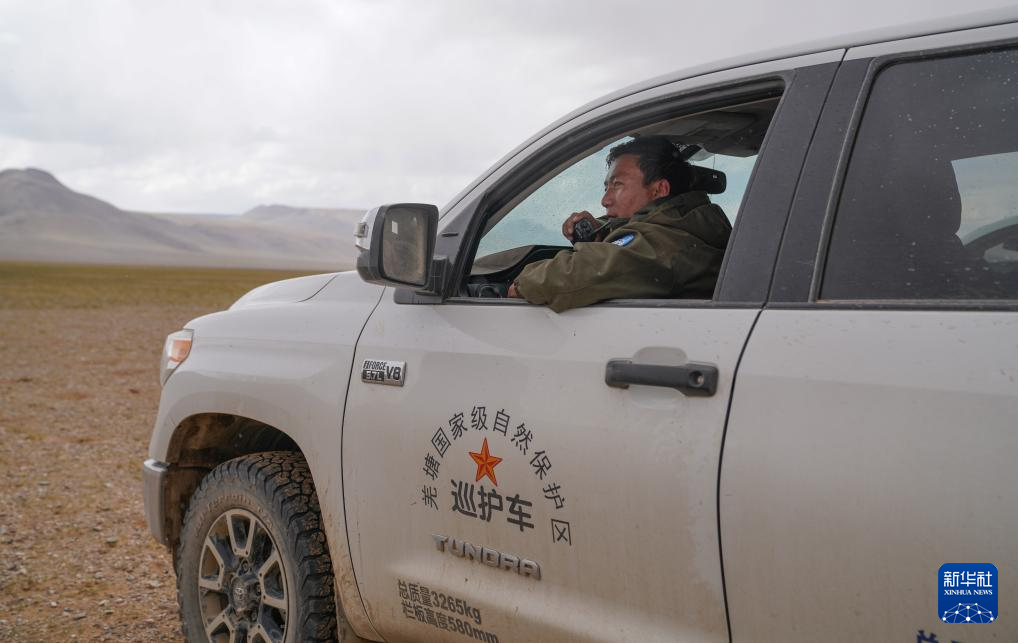 6月15日,羌塘國家級自然保護區(qū)野生動物專業(yè)管護隊員羅布通過對講機聯(lián)系巡邏路上的隊員。新華社記者 晉美多吉 攝