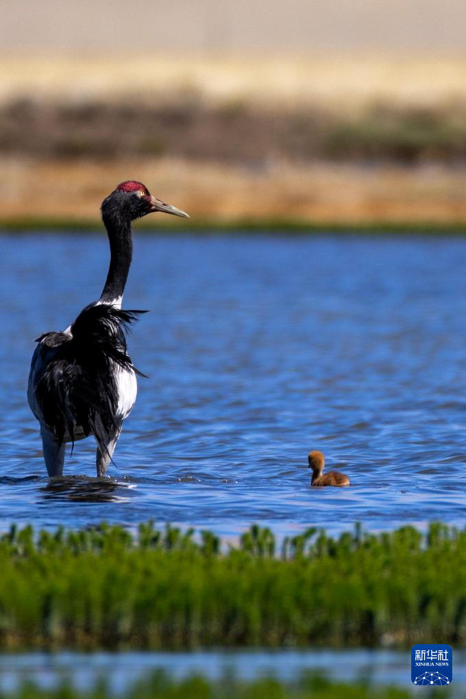 這是在那曲市申扎縣拍攝的養(yǎng)育雛鳥的黑頸鶴(6月9日攝)。新華社記者 姜帆 攝