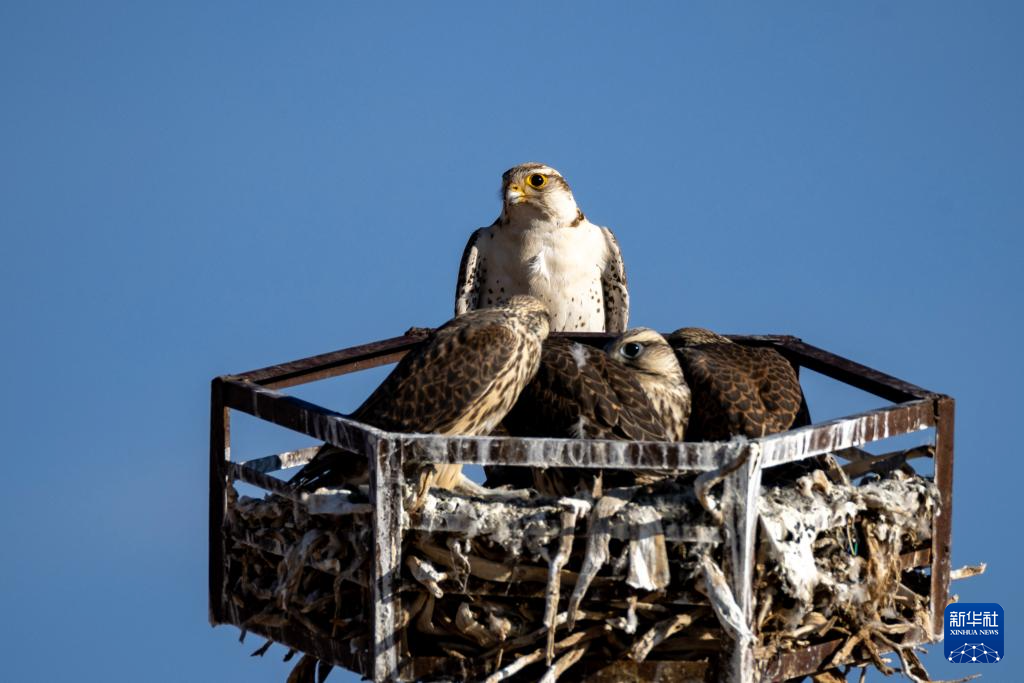 這是在那曲市尼瑪縣拍攝的養(yǎng)育雛鳥的游隼,它們?cè)凇盁o人區(qū)”中林草部門樹立的“鷹架”上營巢(6月13日攝)。新華社記者 姜帆 攝