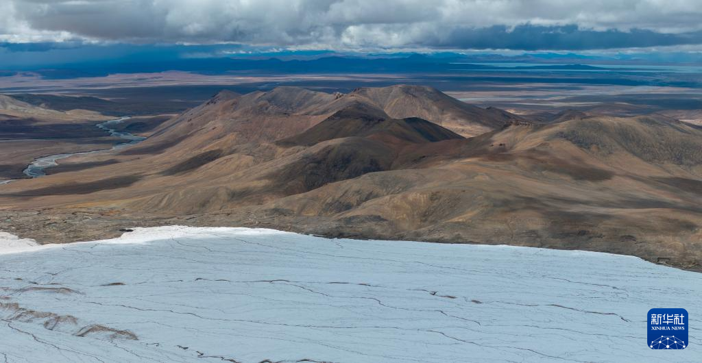 這是9月4日拍攝的普若崗日冰原8號冰川、消融形成的徑流以及遠處的令戈錯(無人機拼接照片)。新華社記者 姜帆 攝