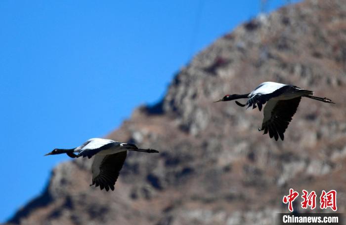 黑頸鶴是全球十五種鶴類(lèi)中唯一在高原地區(qū)繁殖和越冬的鶴類(lèi),被譽(yù)為“高原神鳥(niǎo)”,屬中國(guó)國(guó)家一級(jí)保護(hù)動(dòng)物。每年10月中下旬左右,黑頸鶴陸續(xù)飛抵雅魯藏布江中游河谷等地越冬。圖為11月3日,黑頸鶴在西藏拉薩達(dá)孜區(qū)上空飛翔。中新社記者 李林 攝