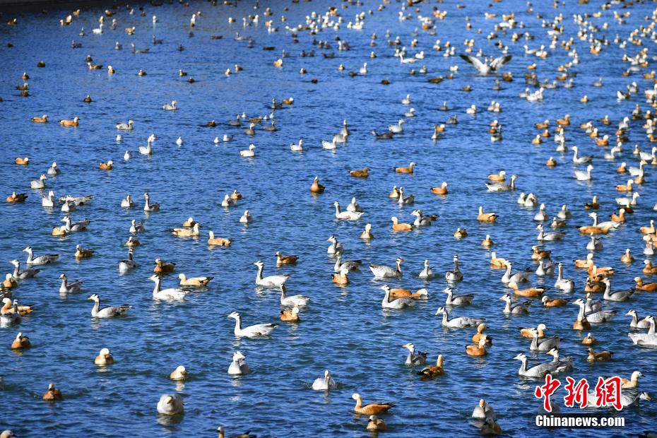 12月17日,入冬以來,大批候鳥飛抵拉薩棲息越冬。拉薩河、宗角祿康公園等地,成為它們的天堂。在拉薩河,赤麻鴨、斑頭雁成群,時而覓食,時而嬉戲。宗角祿康公園的湖面上,候鳥閑游踱步,安然自在,展現(xiàn)出一幅和諧的生態(tài)畫卷。圖為12月17日,斑頭雁、赤麻鴨等候鳥在拉薩河里覓食、嬉戲。