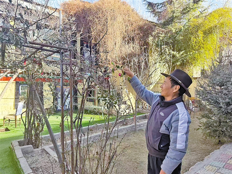 拉薩市城關(guān)區(qū)慈覺林村村民次頓珠在清理院子里的月季樹枝。記者 文鳳 攝