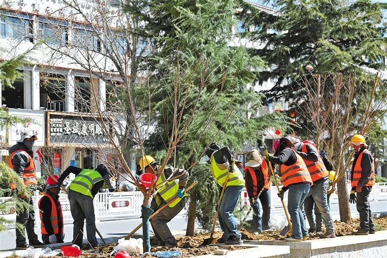 圖為養(yǎng)護工人在種樹。記者 洛桑 攝