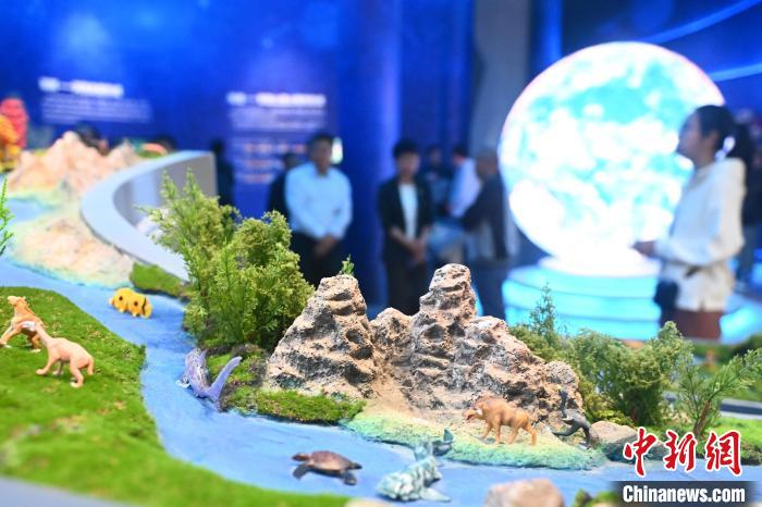 6月16日,在位于甘肅省張掖市肅南裕固族自治縣的祁連山國(guó)家公園自然博物館內(nèi),游人參觀祁連山動(dòng)植物演化沙盤模型。中新社記者 李亞龍 攝