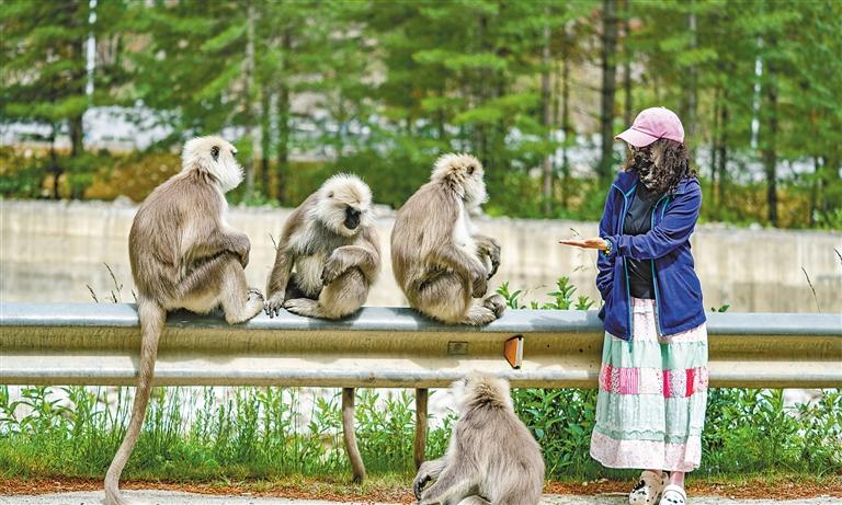 近年來,隨著西藏日喀則市亞東縣生態(tài)環(huán)境治理水平持續(xù)提升,生態(tài)環(huán)境日益向好。長尾葉猴時常下山與居民、游客親密互動,已成為一道獨特的風(fēng)景線。
