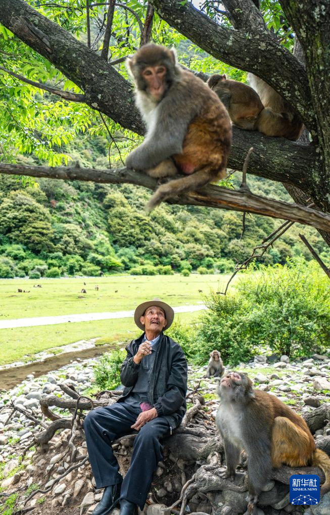 在林則生態(tài)文化旅游景區(qū),多布杰老人給藏獼猴拍照(7月23日攝)。新華社記者 丁增尼達 攝