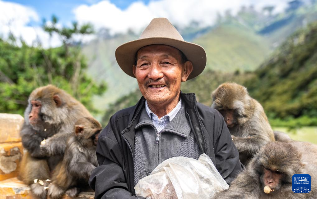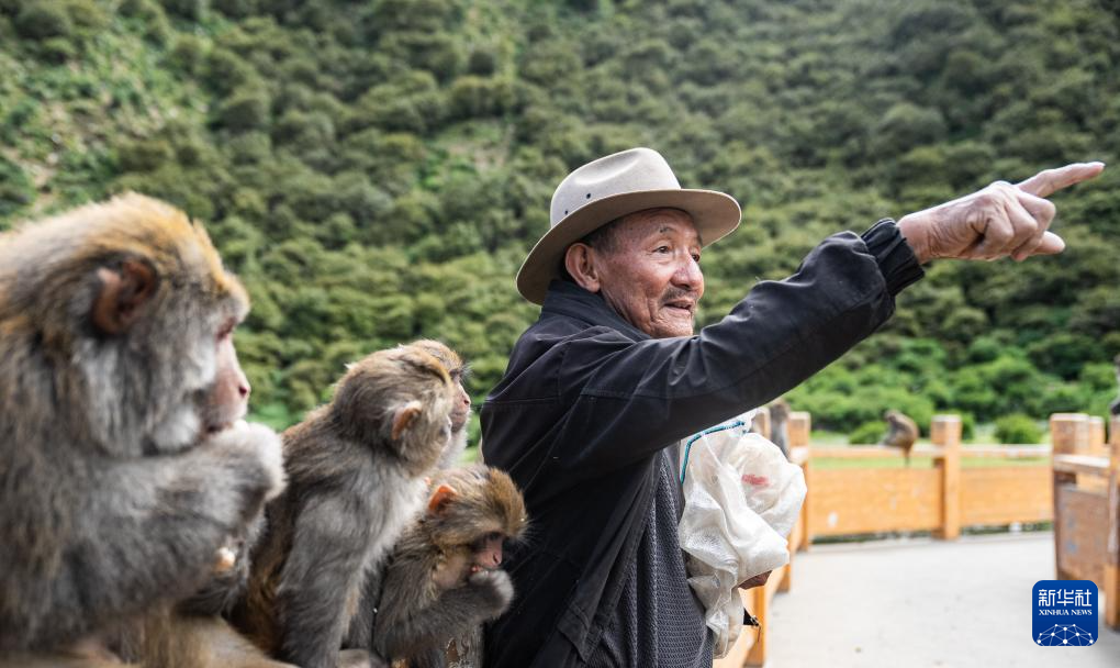 在林則生態(tài)文化旅游景區(qū),多布杰老人在給藏獼猴喂花生(7月23日攝)。新華社記者 丁增尼達 攝