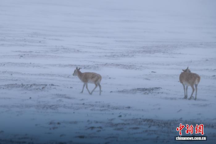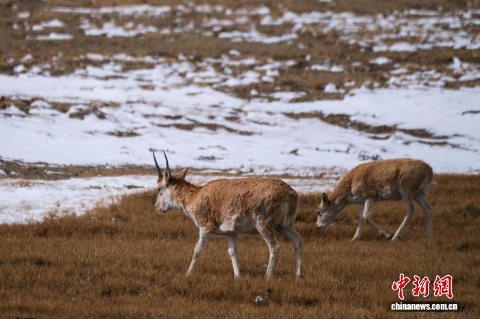 圖為10月9日,在兩只藏羚羊在雪原中覓食。江飛波 攝