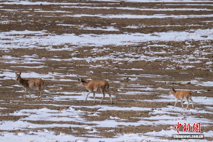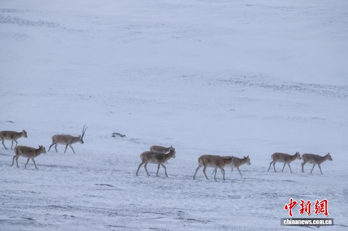 近日,中新網(wǎng)記者在西藏自治區(qū)阿里、那曲等地記錄到藏羚羊群活動影像。畫面中,藏羚羊群或低頭覓食,或結(jié)伴而行,在高原的雪原與草原之間勾勒出和諧畫卷。據(jù)悉,近年來,西藏藏羚羊種群規(guī)模一直持續(xù)擴大。2024年西藏自治區(qū)生態(tài)環(huán)境廳發(fā)布的《2023西藏自治區(qū)生態(tài)環(huán)境狀況公報》顯示,西藏境內(nèi)藏羚羊數(shù)量增長到30多萬只。圖為10月9日,在西藏阿里地區(qū)拍攝到的藏羚羊群。江飛波 攝