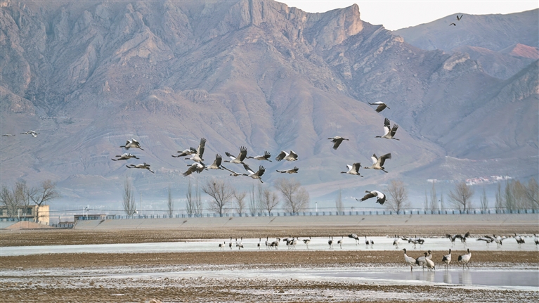 位于拉薩市林周縣黑頸鶴自然保護區(qū)內(nèi),大批越冬黑頸鶴現(xiàn)身田間地頭,悠閑覓食、嬉戲。這些遠道而來的黑頸鶴,將在此棲息至次年三四月份。黑頸鶴為中國國家一級保護動物,也是唯一在高原生活、繁殖的鶴類。