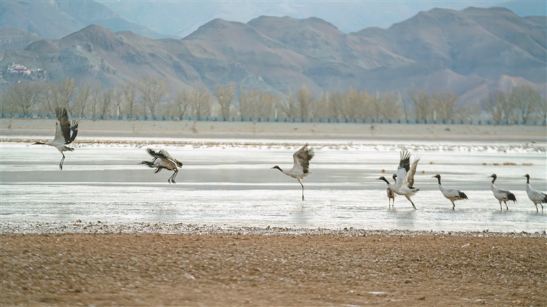 1月17日,天還未亮,拉薩市林周縣卡孜水庫的上空便回蕩著黑頸鶴的鳴唱。