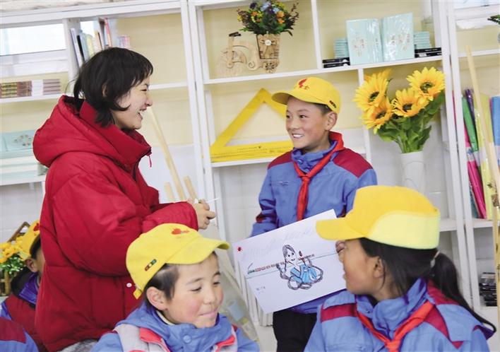美術(shù)教室布置之初,從一年級到六年級,二三十名學(xué)生追到新教室,拿著彩筆在墻上畫出一幅幅稚嫩卻充滿童趣的圖畫?!拔蚁氘嬕粋€城堡,給它圖上美麗的顏色!”“我要把牦牛畫在墻上。”“我要畫個飛行員”……