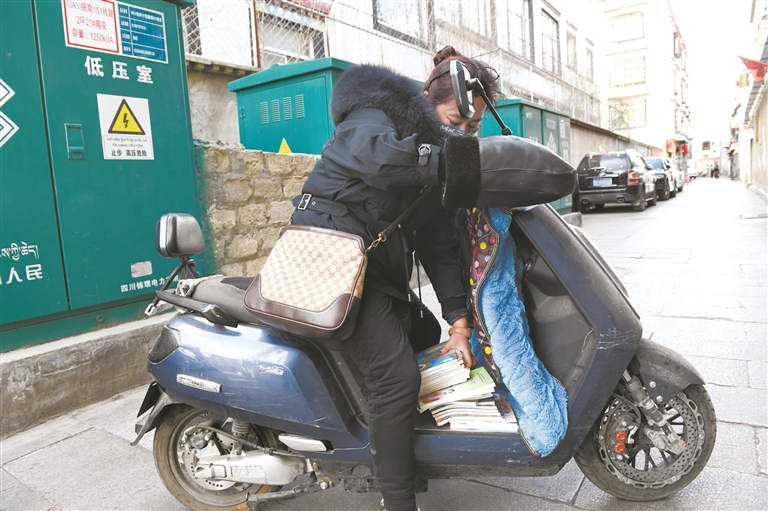 圖為城關(guān)區(qū)第二小學(xué)三年級(jí)(11)班班主任旦增色珍騎著電動(dòng)車把分類分揀好的教材送到學(xué)生家中。