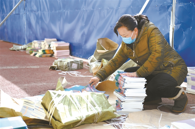 圖為城關(guān)區(qū)雪小學(xué)一年級(jí)(3)班次旦卓嘎老師在分揀本班教材。(本組圖片由拉薩融媒視覺(jué)組攝)