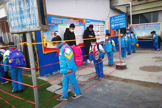 3月30日上午10時,記者在西藏那曲市浙江中學(xué)門口看到同學(xué)們穿著干凈整潔的校服,在老師們的統(tǒng)一指揮下依次排隊(duì)前后間隔一米距離,按順序測量著體溫、擦拭著免洗手液、換戴學(xué)校發(fā)放的新口罩走向教室。