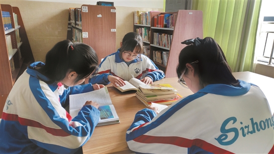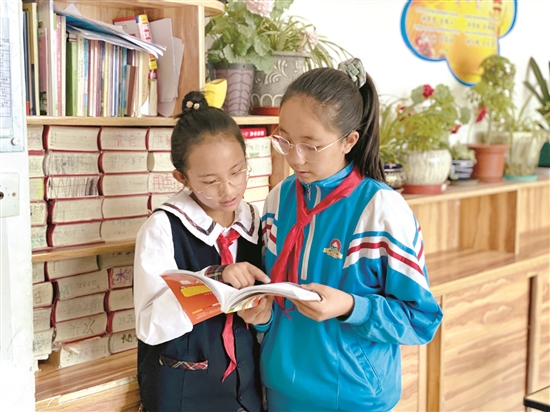 圖為課外時間,貢吉(左)與好朋友分享閱讀過程中看到的經(jīng)典語句。 拉薩融媒記者 靳敏攝