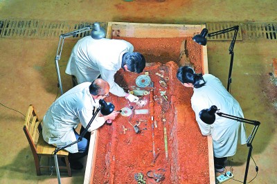 考古工作人員對江西南昌西漢海昏侯墓園五號墓的內(nèi)棺進行清理。新華社發(fā)