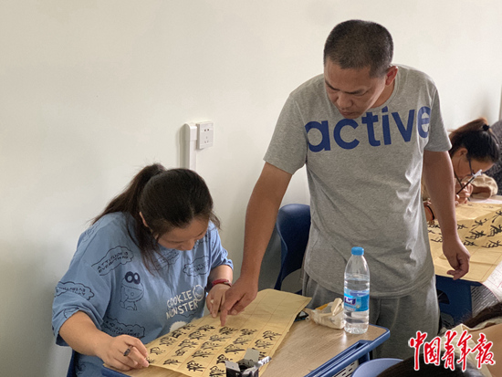 蔡偉在書法課上指導(dǎo)學(xué)生。王景爍攝