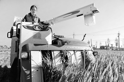 江蘇省太倉市璜涇鎮(zhèn)雅豐農(nóng)場,農(nóng)業(yè)委培大學(xué)生范盈丹駕駛收割機(jī)在稻田間收割水稻。計海新攝/光明圖片