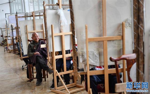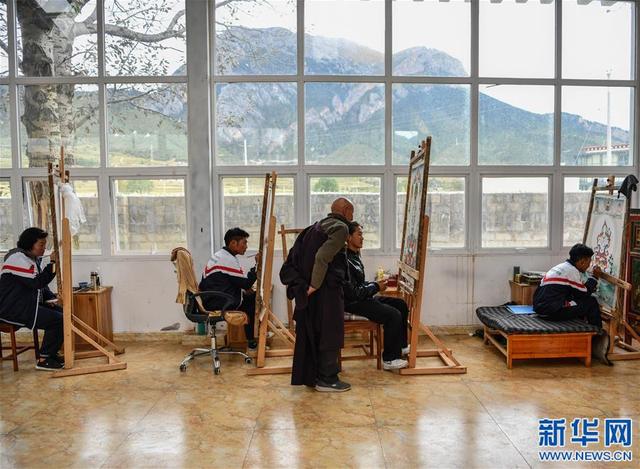 嘎瑪?shù)吕绽先嗽谖鞑夭际锌ㄈ魠^(qū)嘎瑪鄉(xiāng)的民族手工藝培訓(xùn)基地里教學(xué)員們畫唐卡(10月3日攝)。新華社記者 普布扎西 攝