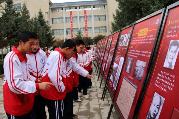 圖為甘肅省平?jīng)鍪徐o寧縣第一中學學生在觀摩“紅軍故事”展板。尹曉軍 楊葉 攝影