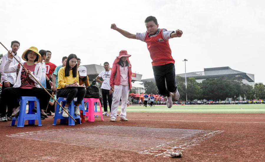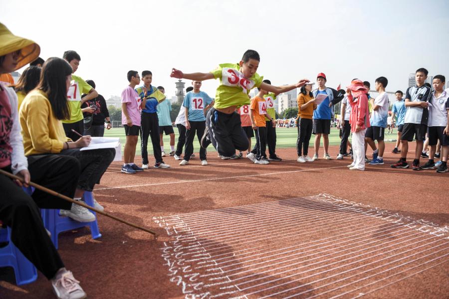 11月26日, 廣西大學(xué)附屬中學(xué)初中年級學(xué)生在立定跳遠(yuǎn)比賽中。新華社記者張愛林?jǐn)z