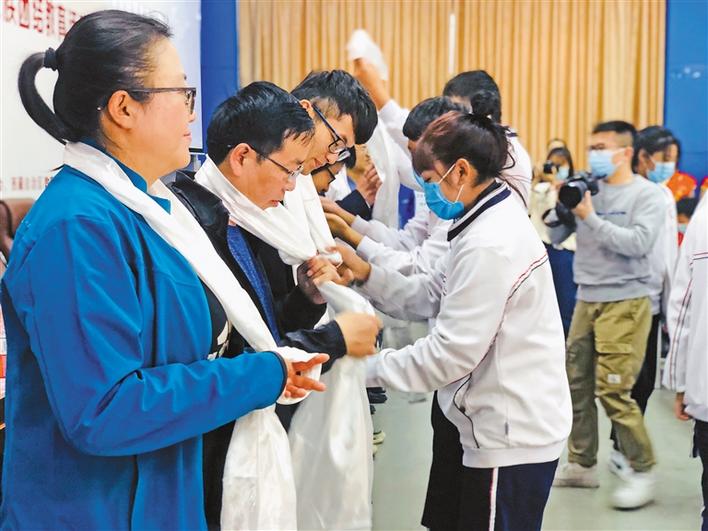 內(nèi)地西藏班師生為宣講組敬獻(xiàn)哈達(dá)。