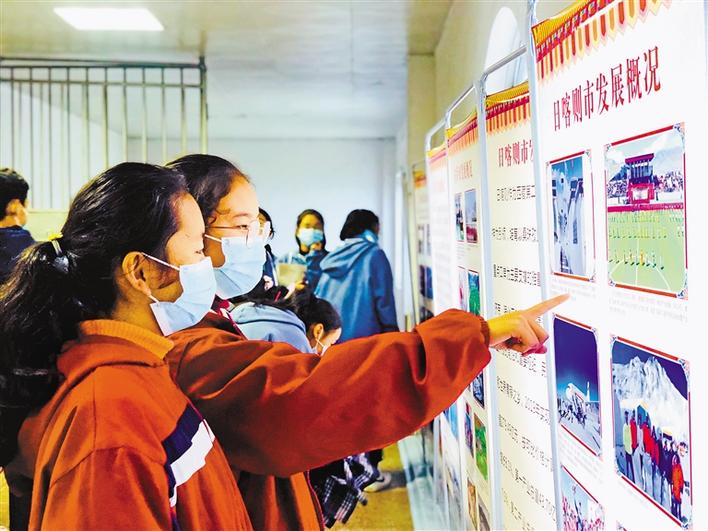 宣講組一行通過(guò)圖片和文字資料,向內(nèi)地西藏班的學(xué)子們展示了西藏翻天覆地的變化及各項(xiàng)事業(yè)取得的成就。圖為內(nèi)地西藏班學(xué)生觀看圖片和文字展。