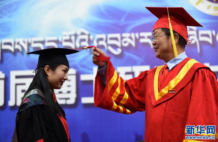 2017年11月10日,西藏大學(xué)舉行首屆博士研究生畢業(yè)典禮,向4名畢業(yè)生授予博士學(xué)位。圖為西藏大學(xué)校長(zhǎng)紀(jì)建洲給博士畢業(yè)生張慧撥流蘇。新華社記者 覺(jué)果 攝