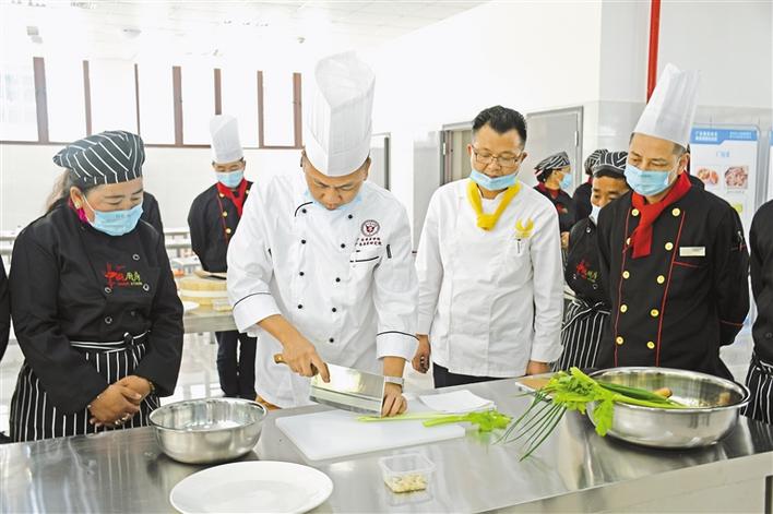 圖為在林芝技工學(xué)?!盎洸藥煾怠奔寄芘嘤?xùn)課上,粵菜老師正在為學(xué)員講解粵菜制作方法。張猛 胡文 攝