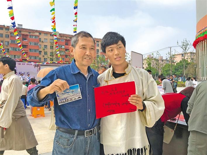 圖為江蘇省南通中學(xué)藏文化社團在南通市北濠社區(qū)開展藏文化宣傳與展示活動時,藏族學(xué)生把藏文書寫的明信片贈送給當?shù)厥忻瘛?圖片由江蘇省南通中學(xué)提供
