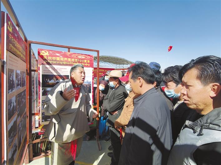圖為在桑珠孜區(qū)甲措雄鄉(xiāng)文化廣場,宣講員結合展板圖文內容開展黨史學習教育宣講。汪純 攝
