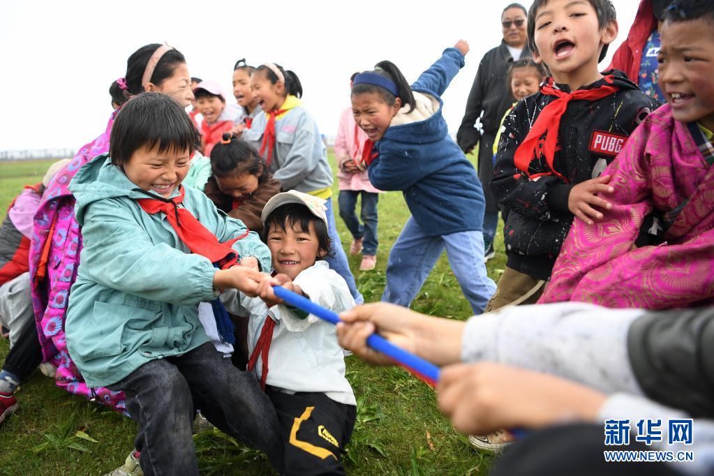 7月14日,河曲馬場小學(xué)的孩子們在草原上進行拔河比賽。新華社記者 陳斌 攝