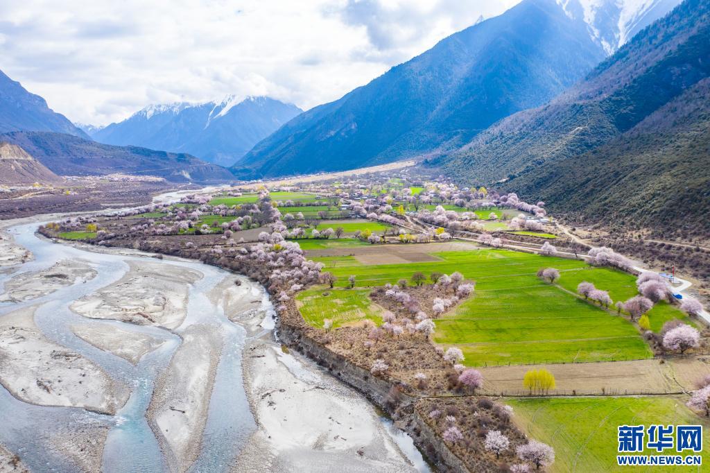 西藏林芝市波密縣境內(nèi)桃花盛開的田園風(fēng)光(2020年3月26日攝,無(wú)人機(jī)照片)。新華社記者普布扎西 攝