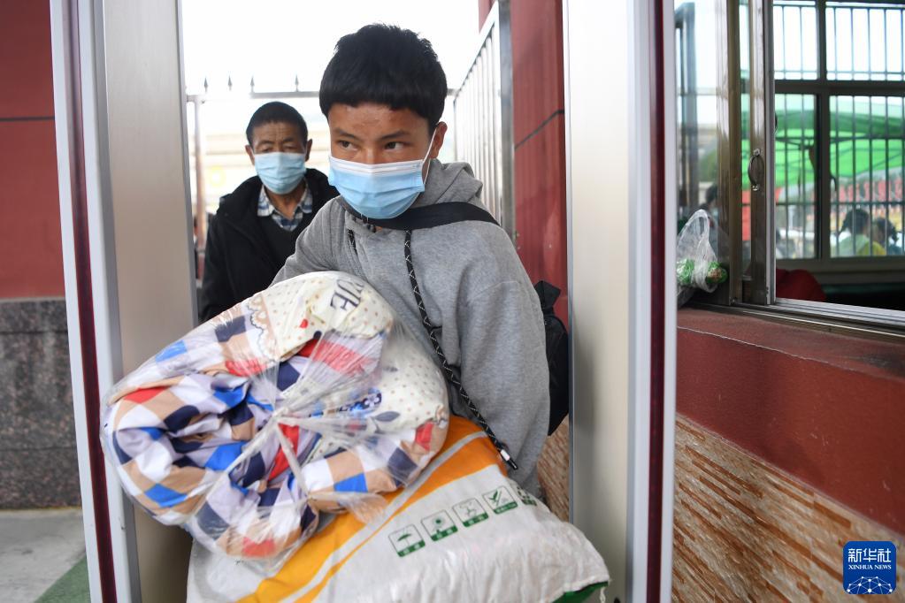碌曲縣藏族中學(xué)高一新生帶著行李通過(guò)測(cè)溫門(mén)到學(xué)校報(bào)到(8月30日攝)。新華社記者 陳斌 攝