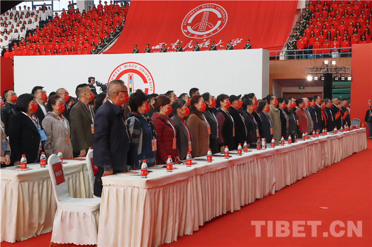 大會(huì)在雄壯的國歌聲中拉開帷幕,西南民族大學(xué)黨委書記楊敏宣布慶祝大會(huì)開始。