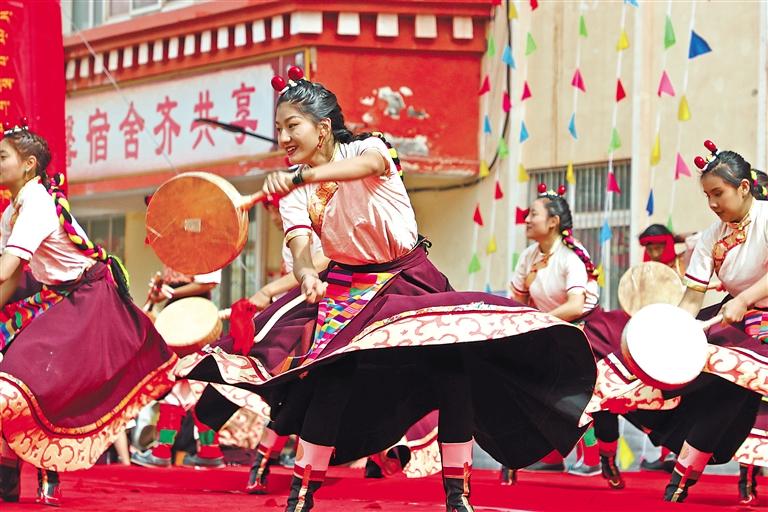 上午十一時(shí),活動(dòng)準(zhǔn)時(shí)舉行。在卡若區(qū)藝術(shù)團(tuán)帶來(lái)的開場(chǎng)舞蹈《彩袖舞出幸?!放炫鹊囊魳仿曋?,“三下鄉(xiāng)”集中示范活動(dòng)正式拉開了帷幕。