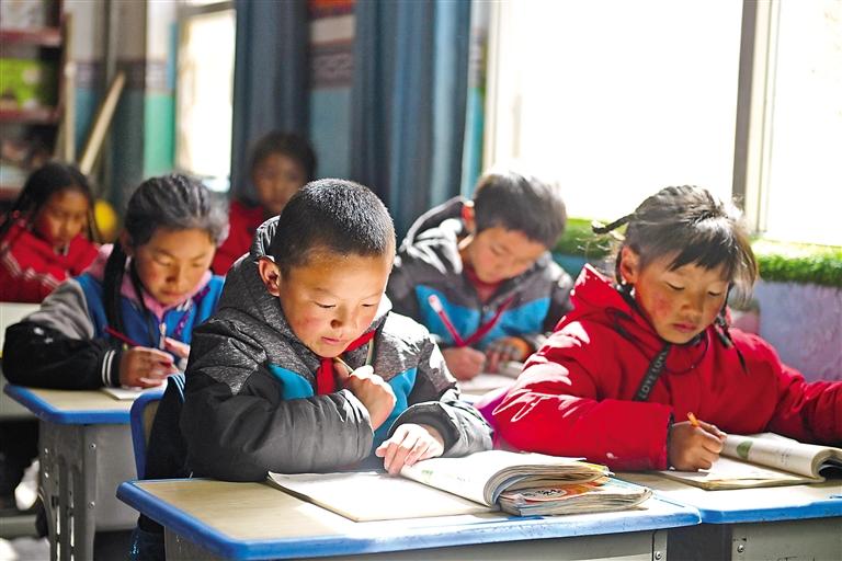 青海省玉樹藏族自治州曲麻萊縣巴干鄉(xiāng)寄宿制小學(xué)的學(xué)生在課堂上學(xué)習(xí)(4月22日攝)。新華社記者 張龍 攝