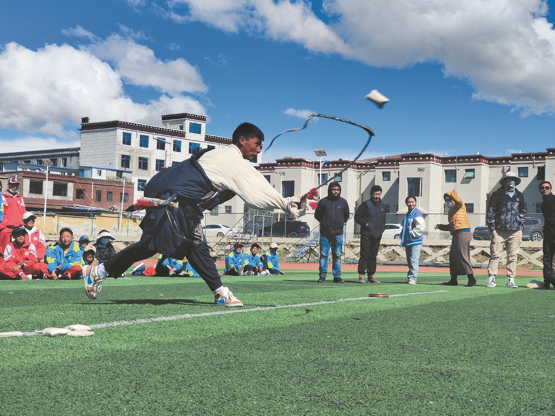 活動中,來自全縣中小學(xué)和幼兒園的學(xué)生分別參加了藏漢文書法、朗讀、歌舞、寫作、繪畫等比賽以及羊拐、“吾多”等傳統(tǒng)競技項目。比賽中學(xué)生們熱情激昂、各展身手,一個個朝氣蓬勃的身影、一件件獨(dú)具特色的作品,展現(xiàn)著牧區(qū)兒女拼搏上進(jìn)的精神風(fēng)貌。“我在家放羊的時候經(jīng)常用‘吾多’,沒想到今天能有展示這個技能的機(jī)會,非常高興?!薄拔岫唷眳①愡x手白瑪頓旦說。