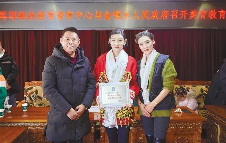 洛桑卓瑪(中)帶領(lǐng)團(tuán)隊前往日喀則市江孜縣金嘎鄉(xiāng)開展美育公益活動。